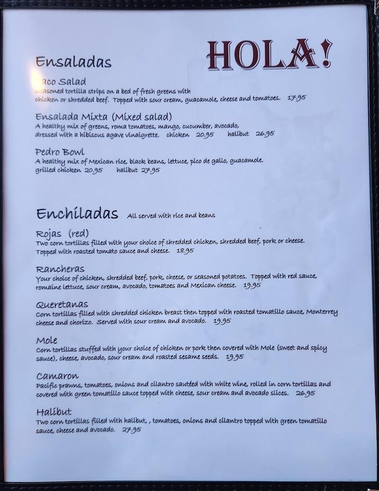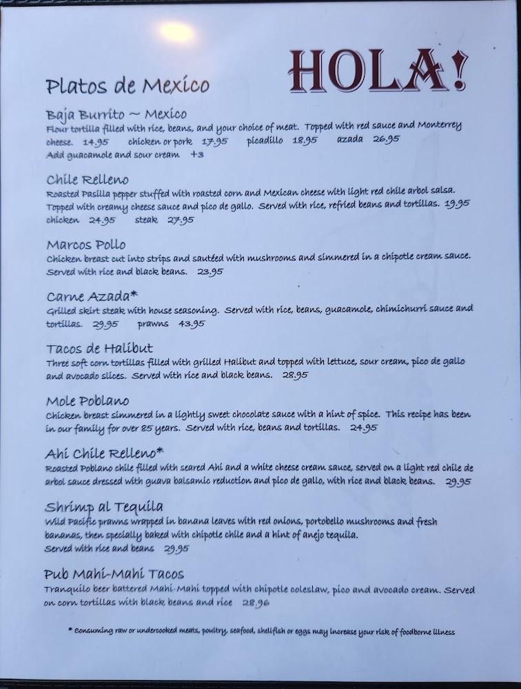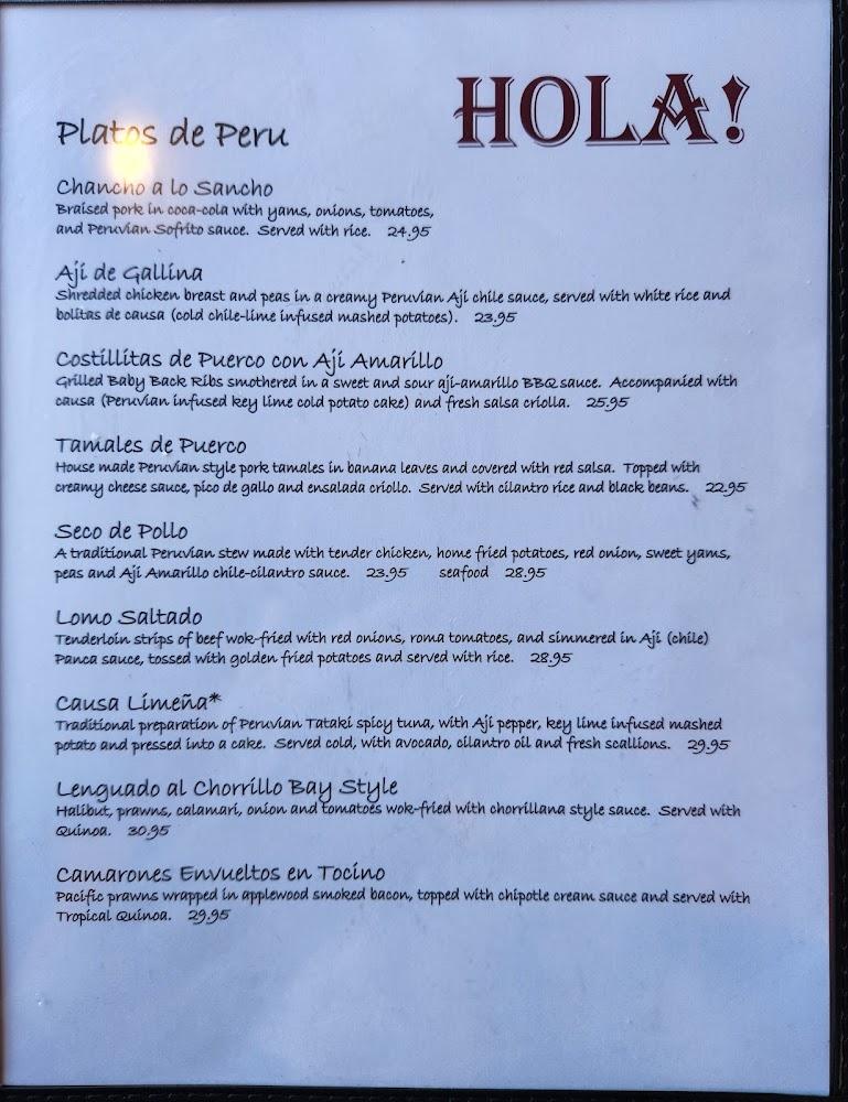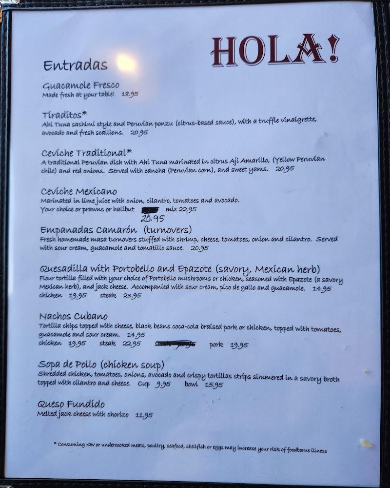 The menu at Hola! Eastside features a wide selection of Mexican and Peruvian dishes.